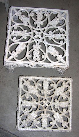 Whether you use the Set of 2 Square Cast Iron Plant Stands for you Potted Garden plants or simply as a Garden Foot Stool, you'll truely enjoy their presence in your outdoor decor. White with lt. brown antiquing. Large stool is 12" x 12" x 8 1/2" high. Smaller stool is 10" x 10" x 6 1/2" high. Read more...